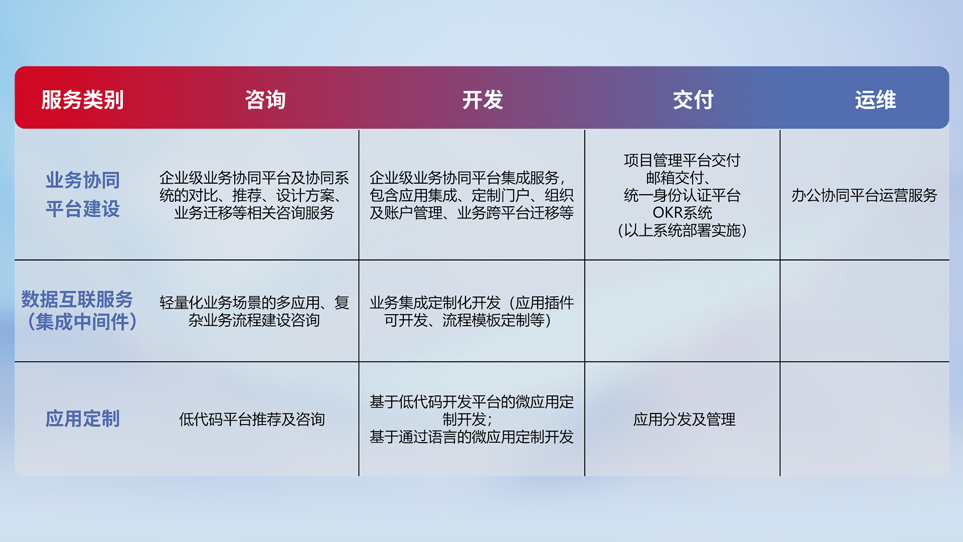 针对钉钉、、、企微、、、IDaas等平台级产品提供产品的规划、、方案、、交付、、、定制化开发等服务,,,实现如统一协同办公、、、智能客户服务、、、、混合会议管理、、、智能数据查询、、等业务场景,,实现数字化转型。。。。
