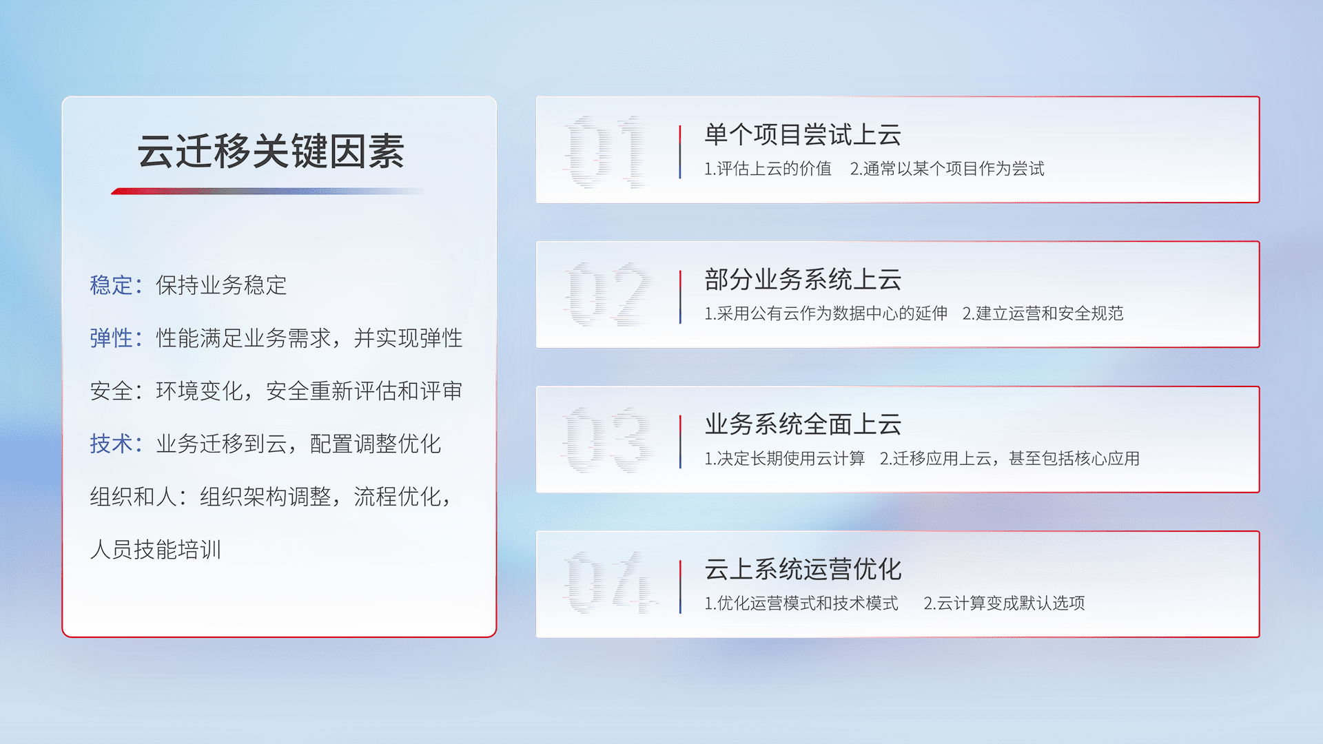 结合实际业务,,,从规划设计、、云平台选型、、、云原生改造、、、数据迁移、、、、集成交付,,,迁移全过程为客户识别最佳上云路径,,,做好风险识别管理,,设计网络架构、、、身份权限、、安全审计合规、、、、操作审计、、、、日志审计、、、监控告警策略、、、、多站点容灾设计等,,对云上基础设施进行整体规划,,提升IT治理水平,,,,以满足弹性、、、、高可用、、高性能的需求。。。。