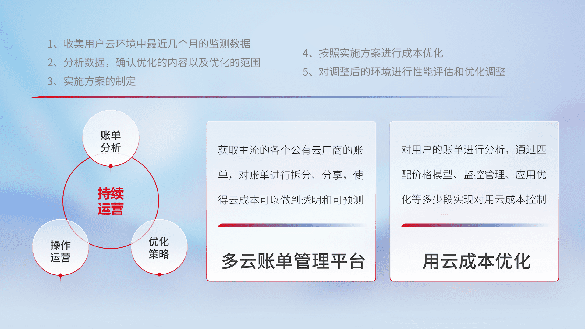 通过灵活运用多种自动化迁移工具,,,帮助企业用户实现业务和数据高效 、、稳定的上云迁移和云上迁移,,,,采用自研多云纳管平台,,,,以中立管理模式,,,解决多组织、、多云、、、、多运维厂商的复杂关系的管理,,保证多云平台资源配置的一致性,,实时掌控云资源运行数据,,,运用智能化工具分析云资源多云平台的管理服务,,,,透明化管理成本支出,,用云成本可预测、、、用云费用可优化、、、、云资源配额有据可依。。