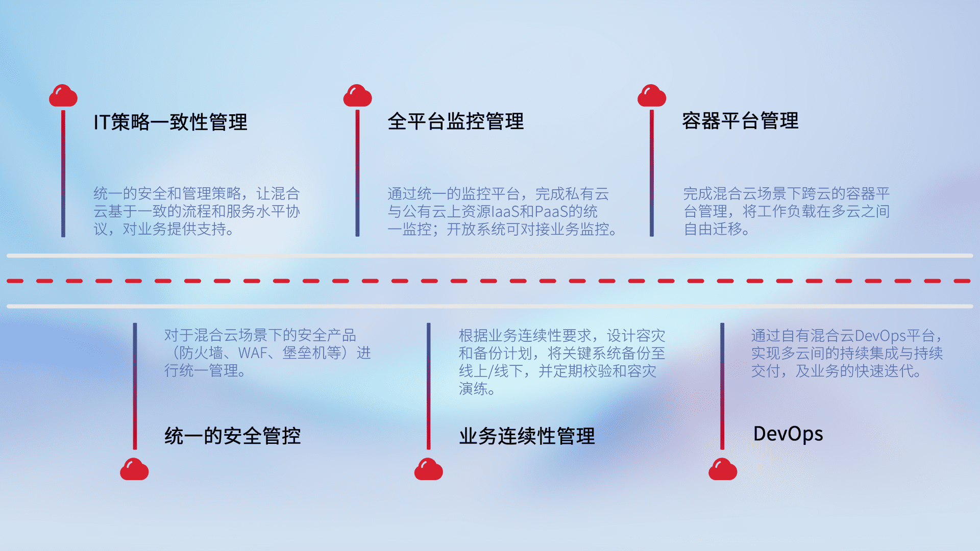 通过多云纳管,,以统一的资源数据模型把客户的云资源进行抽象和封装,,,,进而实现对多云资源的统一操作,,,,保障云资源管理的可靠性、、、、稳定性与可用性。。量身定制化运维内容,,配置、、、、开发运维、、、补丁管理、、、备份、、监控、、、、认证和访问管理、、、审计和日常巡检等,,,保障在用云过程中的可靠度,,稳定度以及高可用率。。