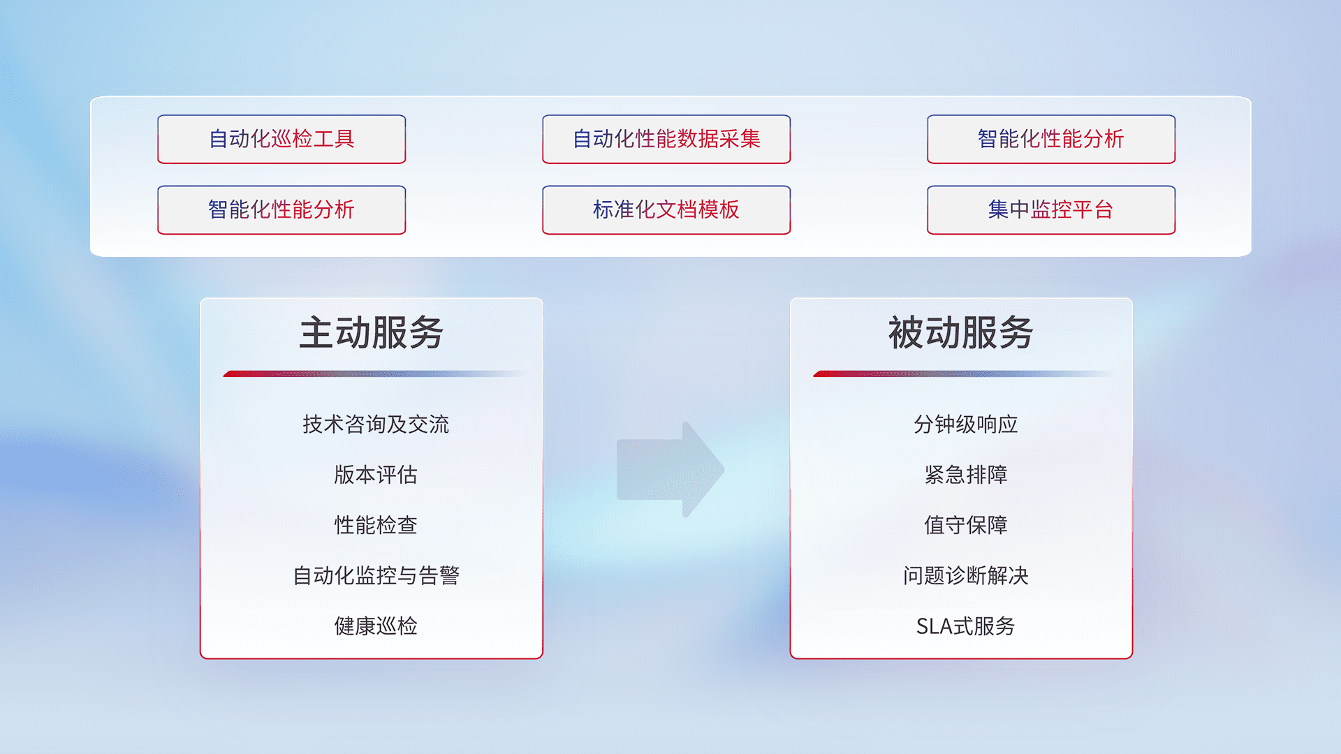 智能化工具和标准化文档,,保障服务质量,,,提供主动服务(包含技术咨询、、版本评估、、、性能检查、、自动化监控与告警、、健康巡检)和被动服务包含(分钟级响应、、、、紧急排障、、、、值守保障、、、问题诊断解决、、、SLA服务)。。。。